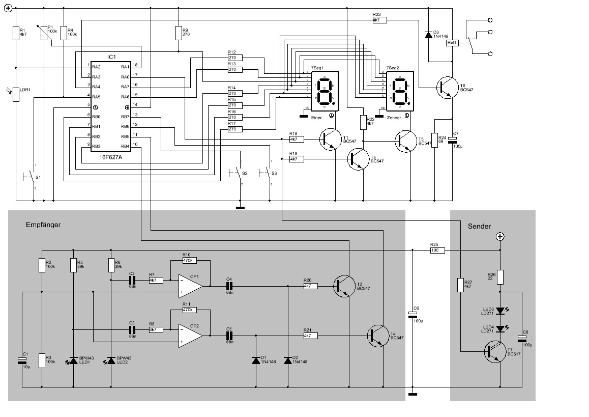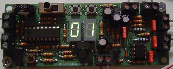Zur Bestimmung der Anzahl der vorhandenen Personen dient ein zentraler Zähler, der über zwei 7-Segemente-Anzeigen dargestellt wird. Negative Zählerstände sind nicht möglich. Der Zähler kann zusätzlich durch jeweils einen Taster erhöht bzw. erniedrigt werden. Sobald der Zähler einen Wert größer Null besitzt, wird die Schaltung des Relais initiiert.